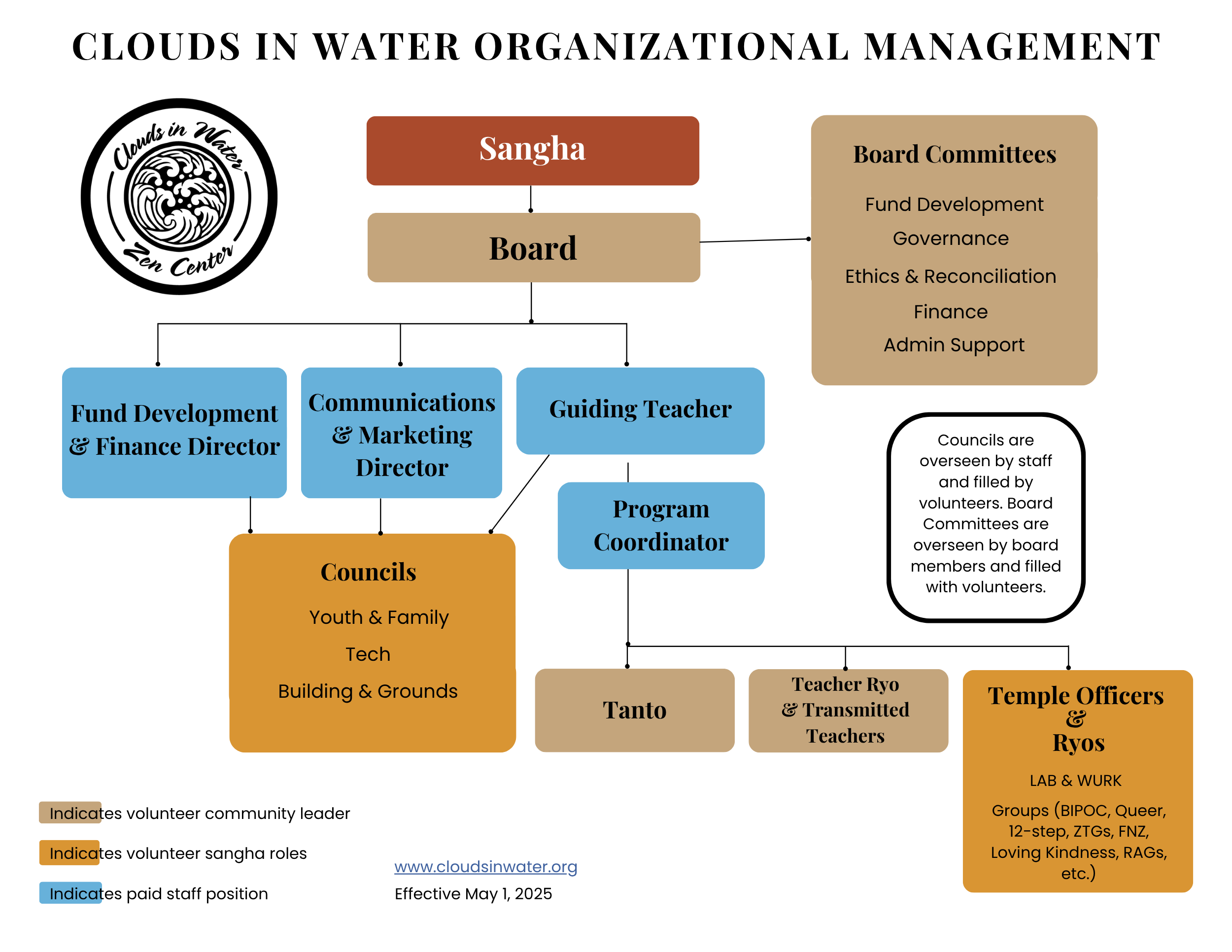 In May, 2025, we began our new, more sustainable, flattened leadership model. Our three directors (Guiding Teacher, Communications & Marketing Director, and Fund Development & Finance Director) all report to the board of directors and work as a team. Our Program Coordinator reports to the Guiding Teacher.